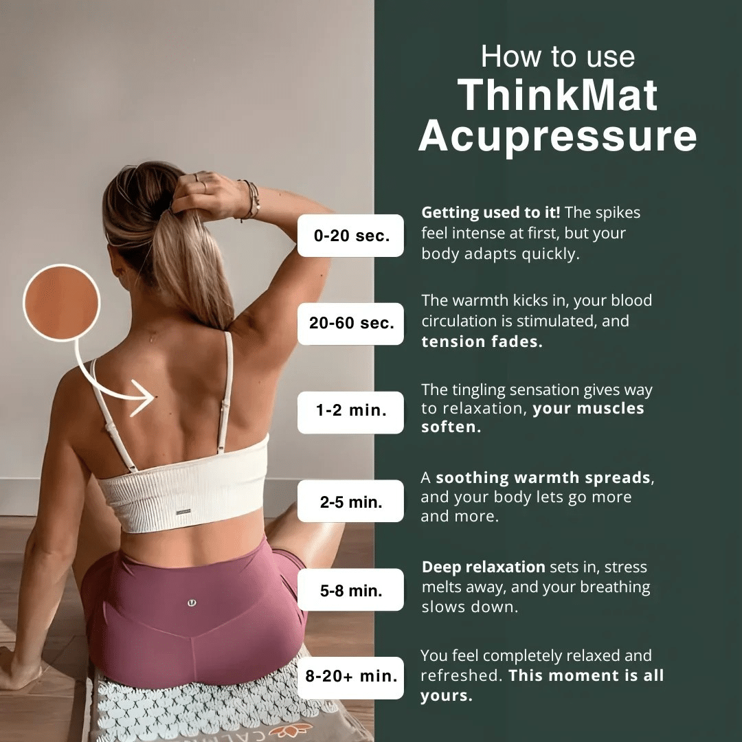 ThinkMat is inspired by traditional acupressure, a practice that targets specific pressure points on the body to restore balance and release tension. When you lie on the mat, the small spikes press into these points, which can increase local blood flow, relax tight muscles, and stimulate the release of endorphins and other feel‑good hormones that support a calmer nervous system.